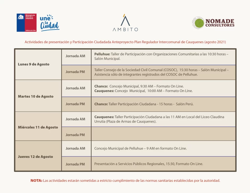 Entre los días 9 y 12 de agosto se llevarán a cabo reuniones de participación con representantes de la comunidad, Concejos Municipales, COSOC y servicios públicos, correspondientes a la etapa de Anteproyecto del Plan Regulador Intercomunal de Cauquenes.