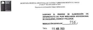 Se informa a las y los interesados en el proceso, que mediante Resolución Exenta N°756 del 16 de agosto de 2023 se ha resuelto suspender el proceso de elaboración y tramitación del Plan Regulador Intercomunal de Cauquenes, el cual se vio entorpecido por razones de fuerza mayor relacionadas con los efectos del temporal de junio de 2023, a raíz de lo cual la SEREMI MINVU de la Región del Maule, titular del proyecto, ha solicitado aclaraciones a la Contraloría General de la República a fin de retomar el proceso de la mejor forma.
